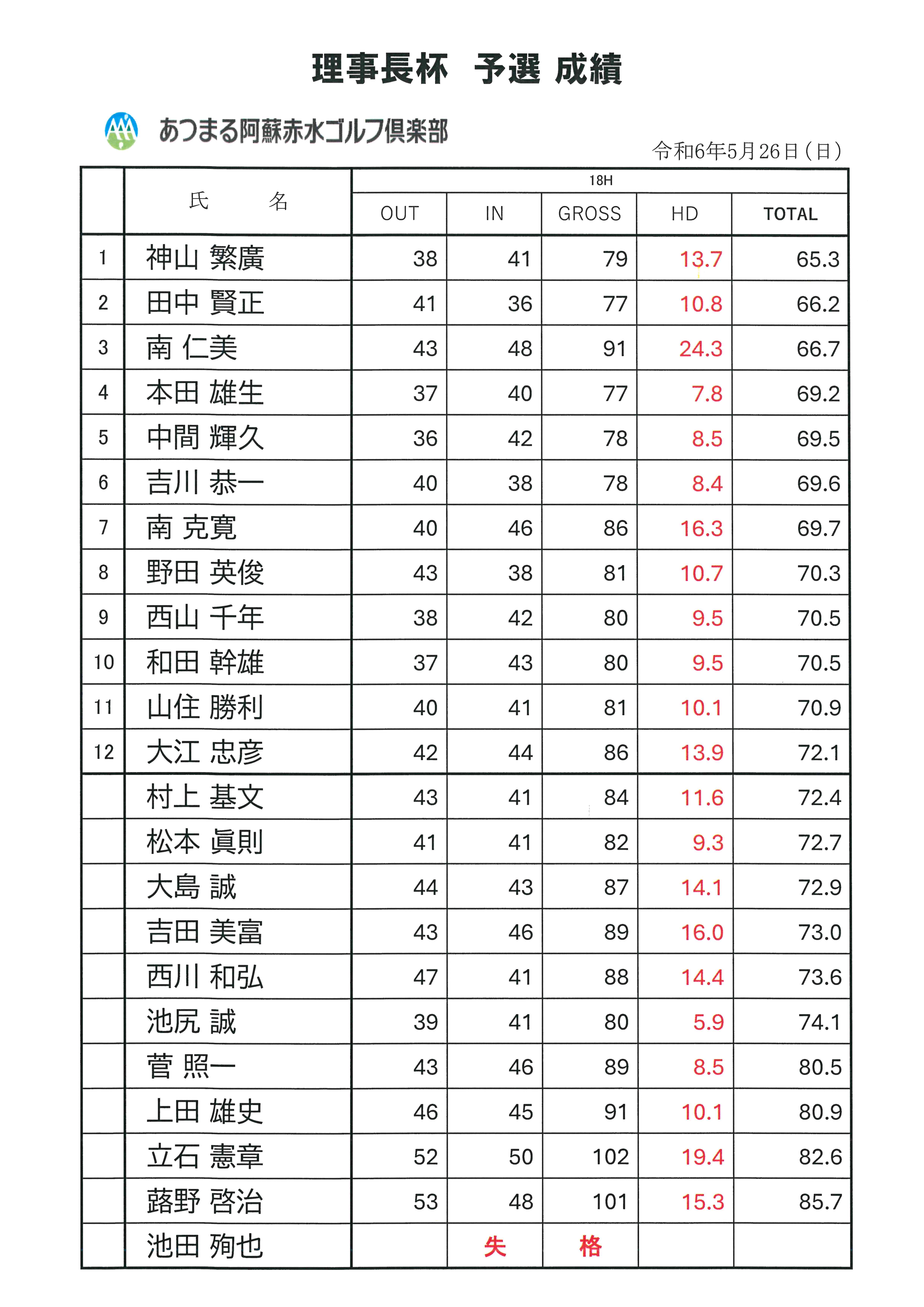 理事長杯予選 成績表