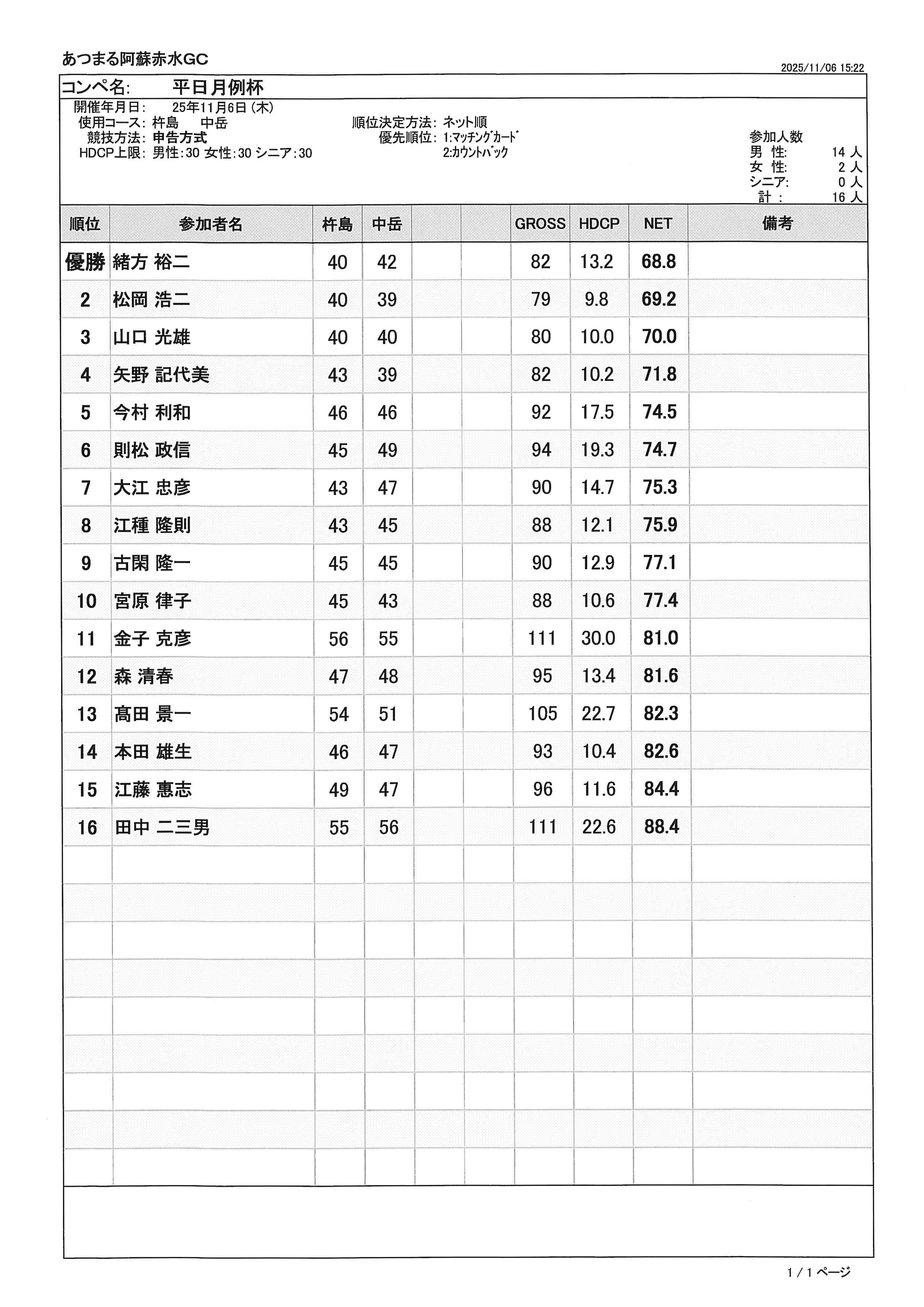 11月平日月例杯