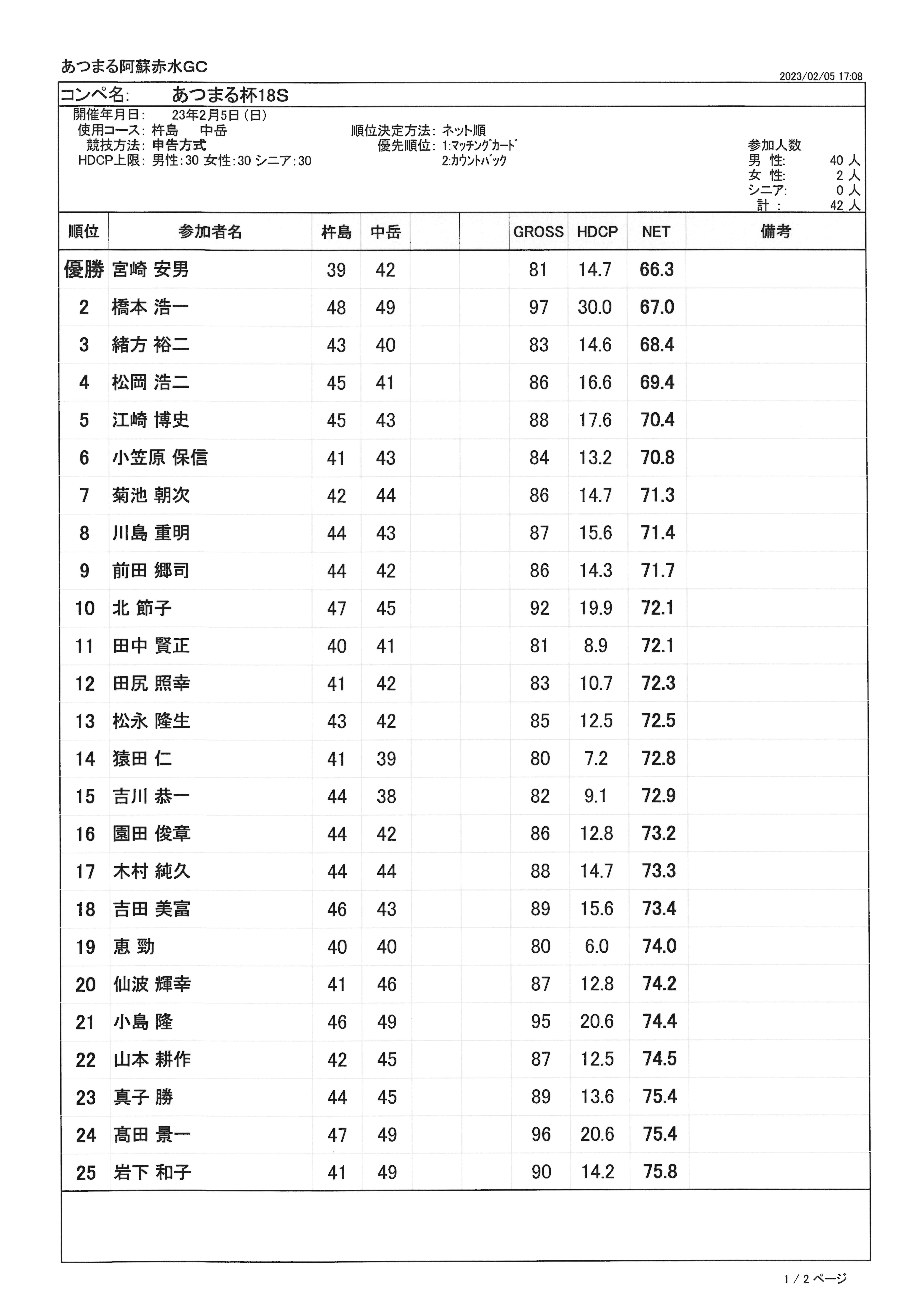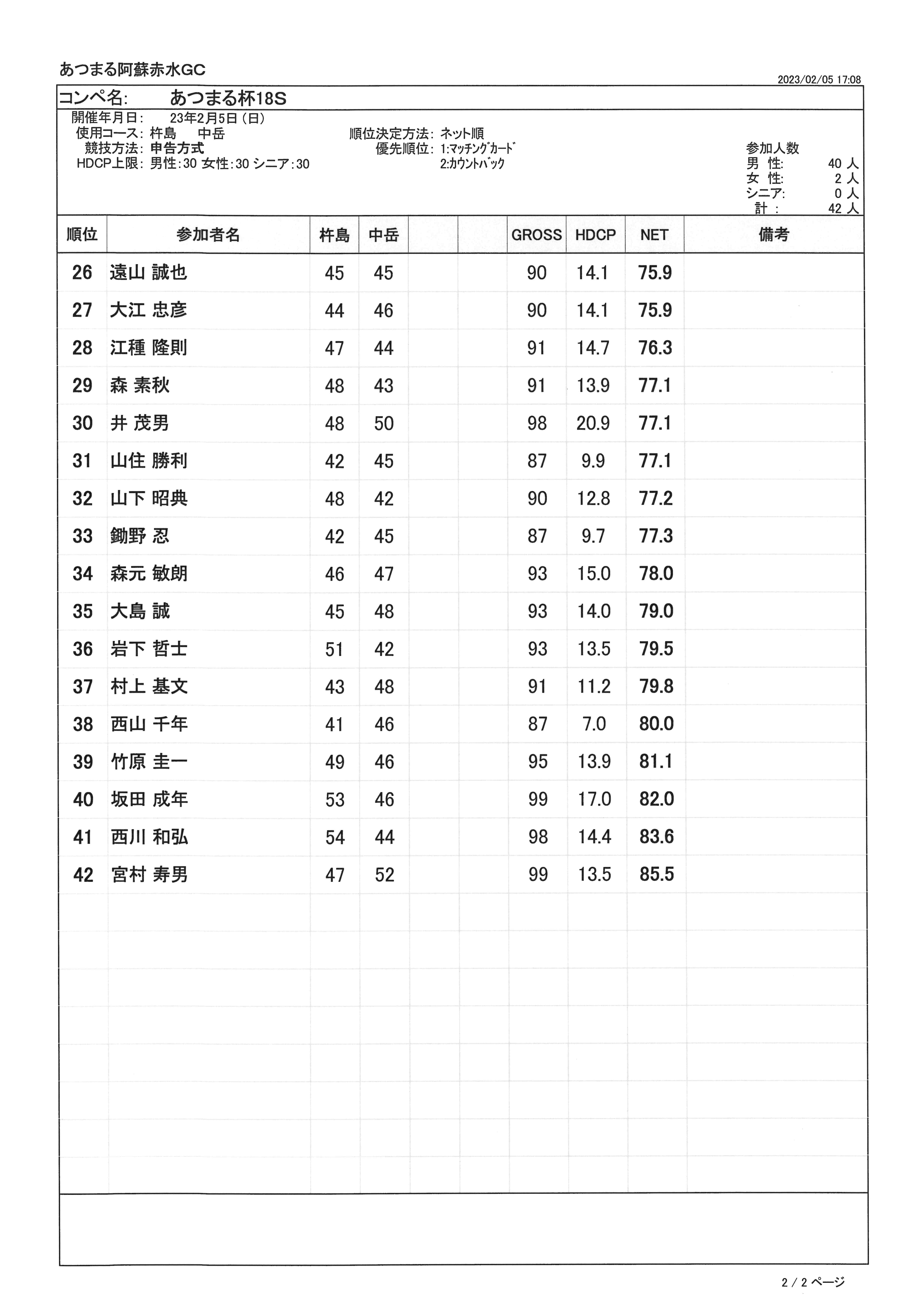 あつまる杯 成績表