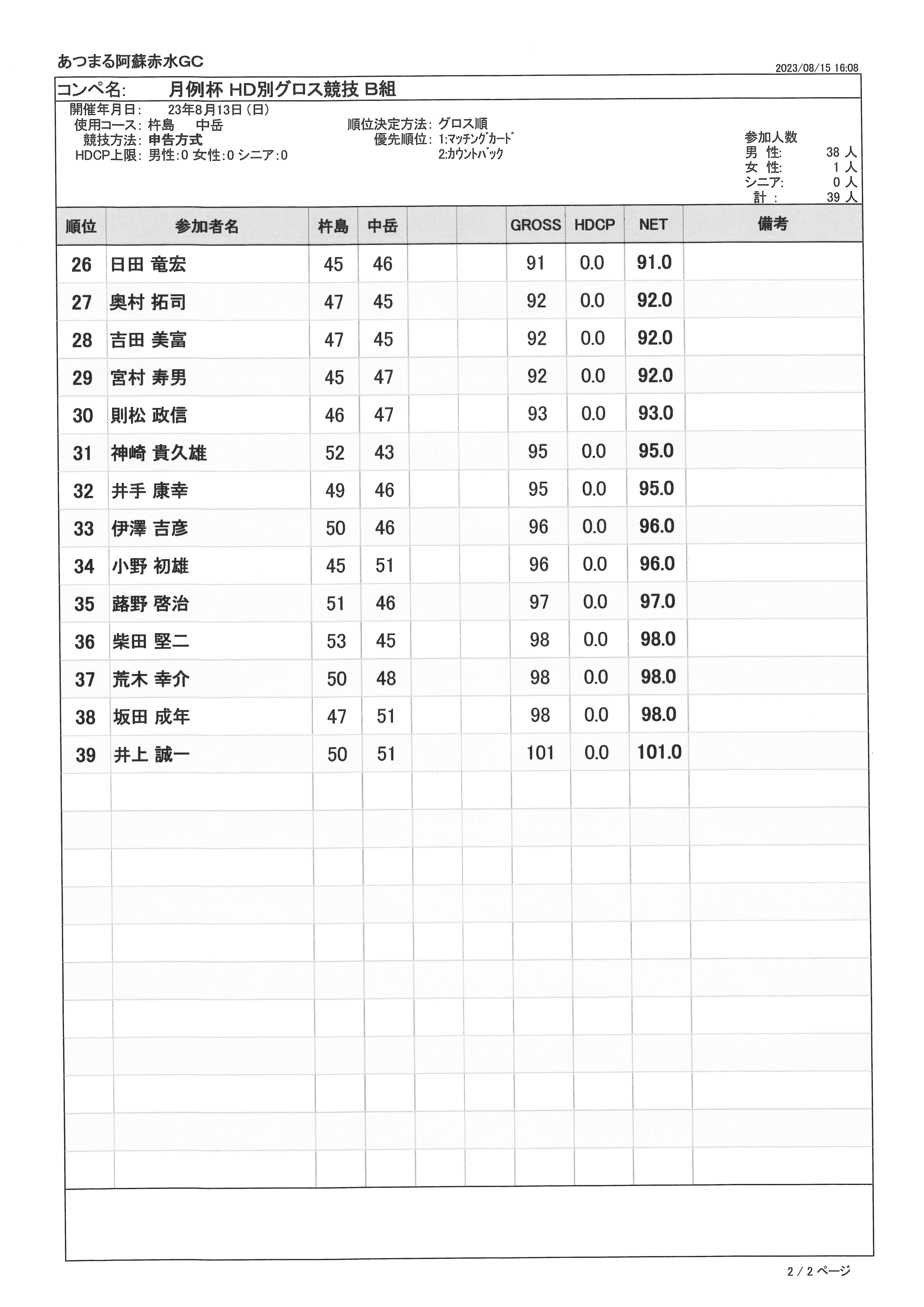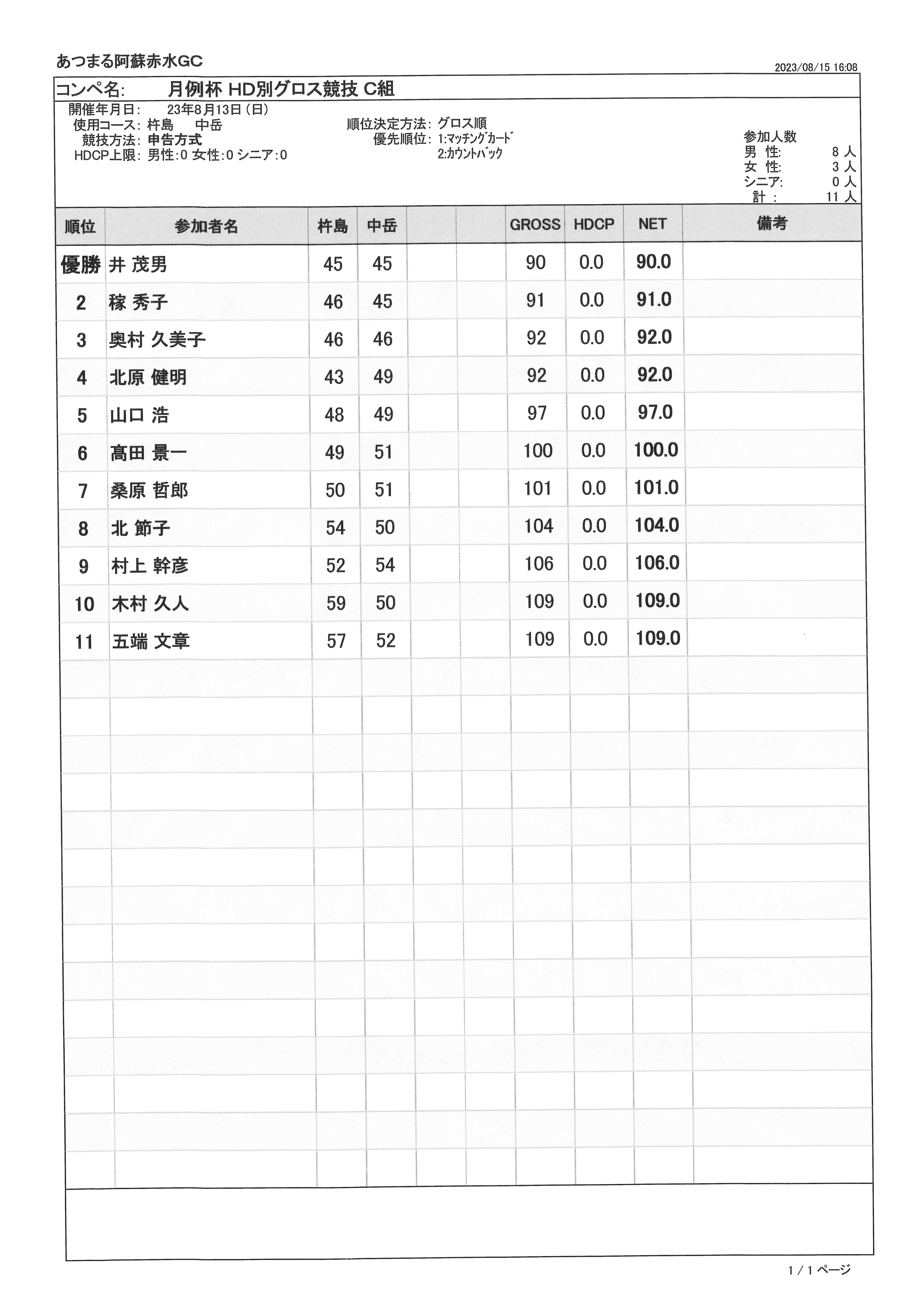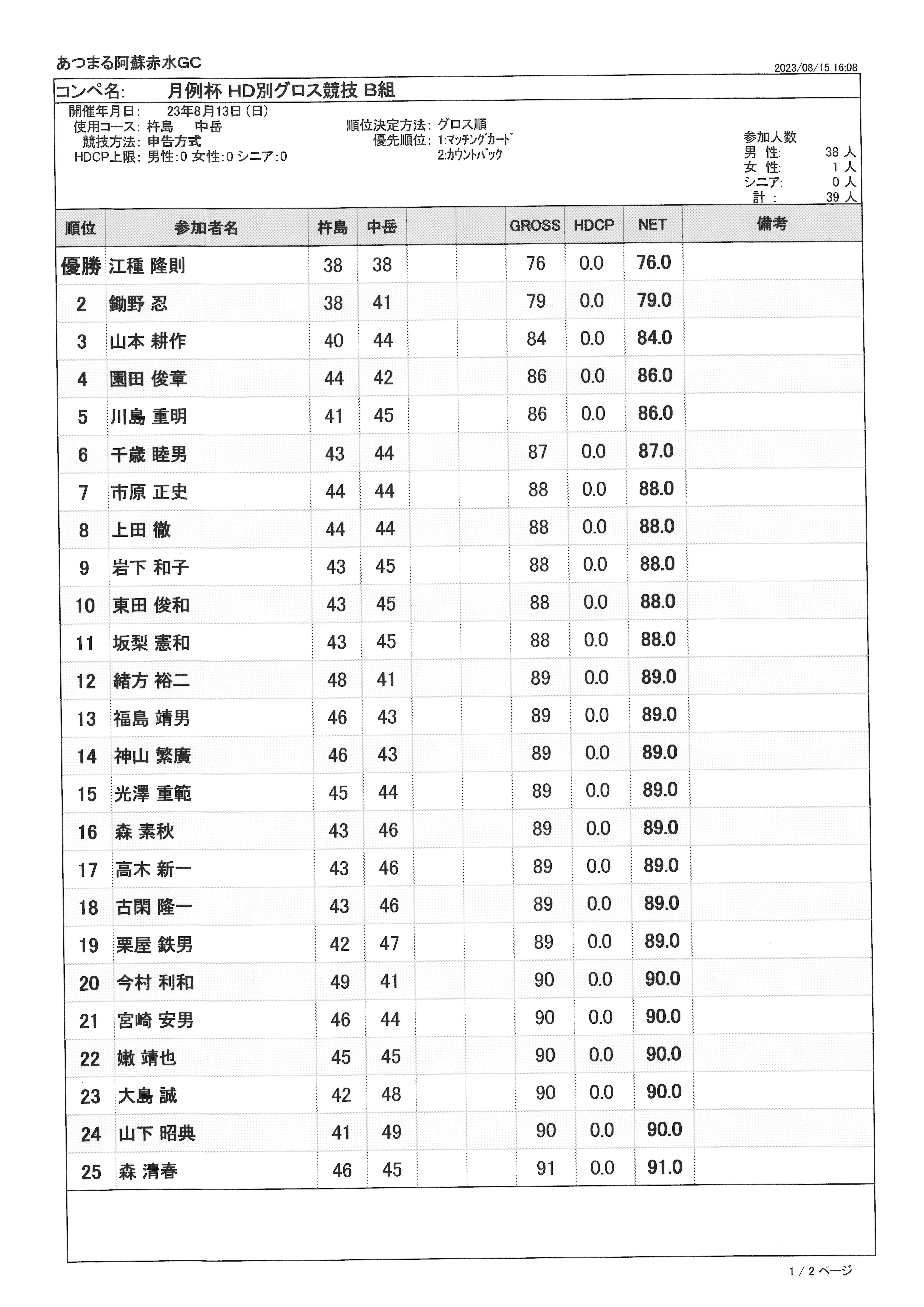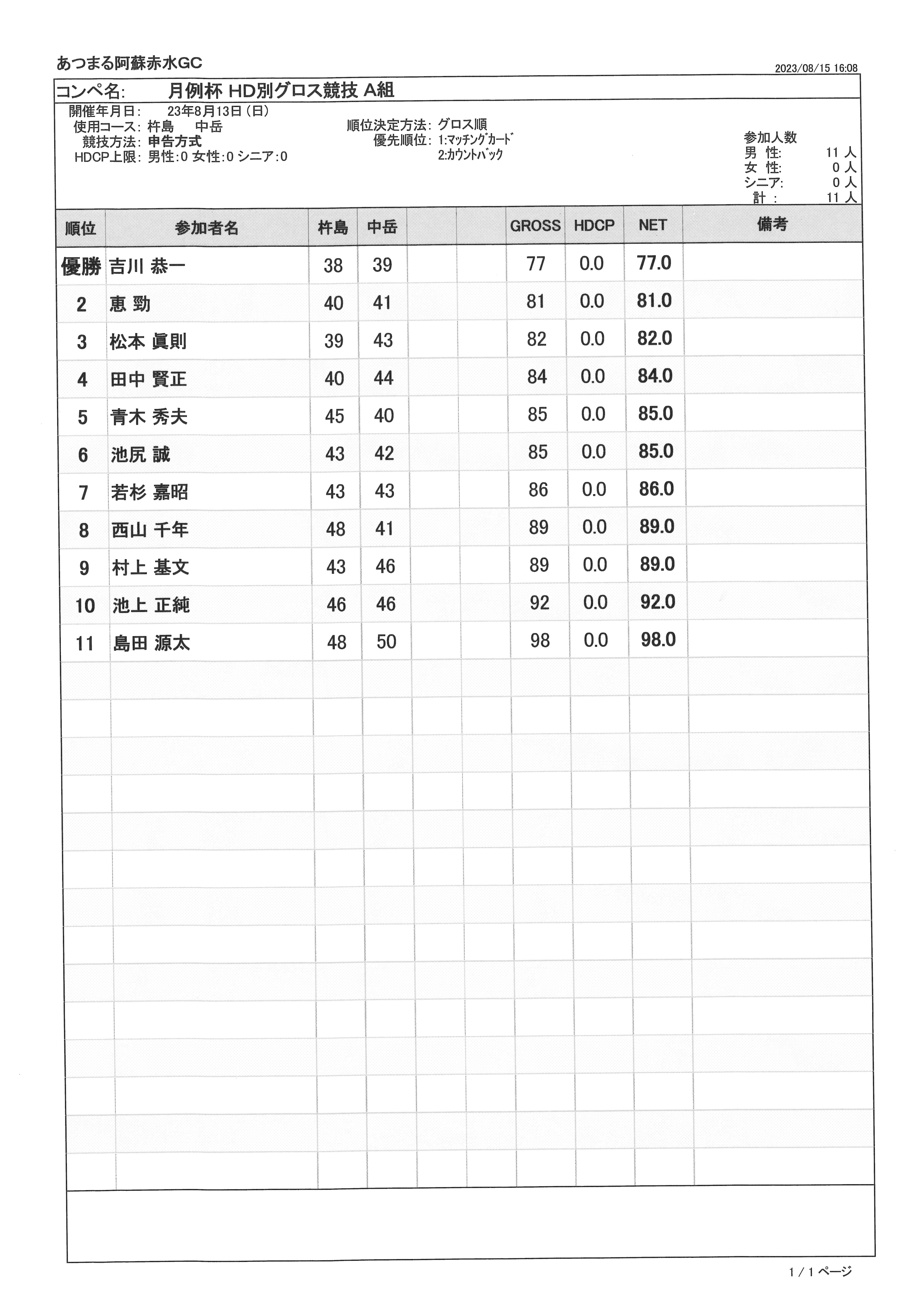 8月度月例杯/ハンディ別グロス競技成績表(8/13開催)